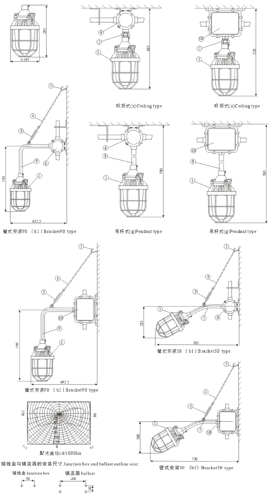 1、按產(chǎn)品型號說明逐條選擇,例:需配用光源為金鹵燈100W、吊桿式安裝、配接線盒、則產(chǎn)品型號為DCG200-L100gH;