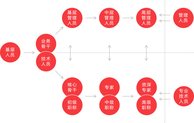 中普所有在職員工均可通過雙重職業發展通道,根據自身特點,結合業務發展,為自己設計切實可行的職業發展通道,并通過不斷提升自身工作能力,逐步實現職業發展規劃。